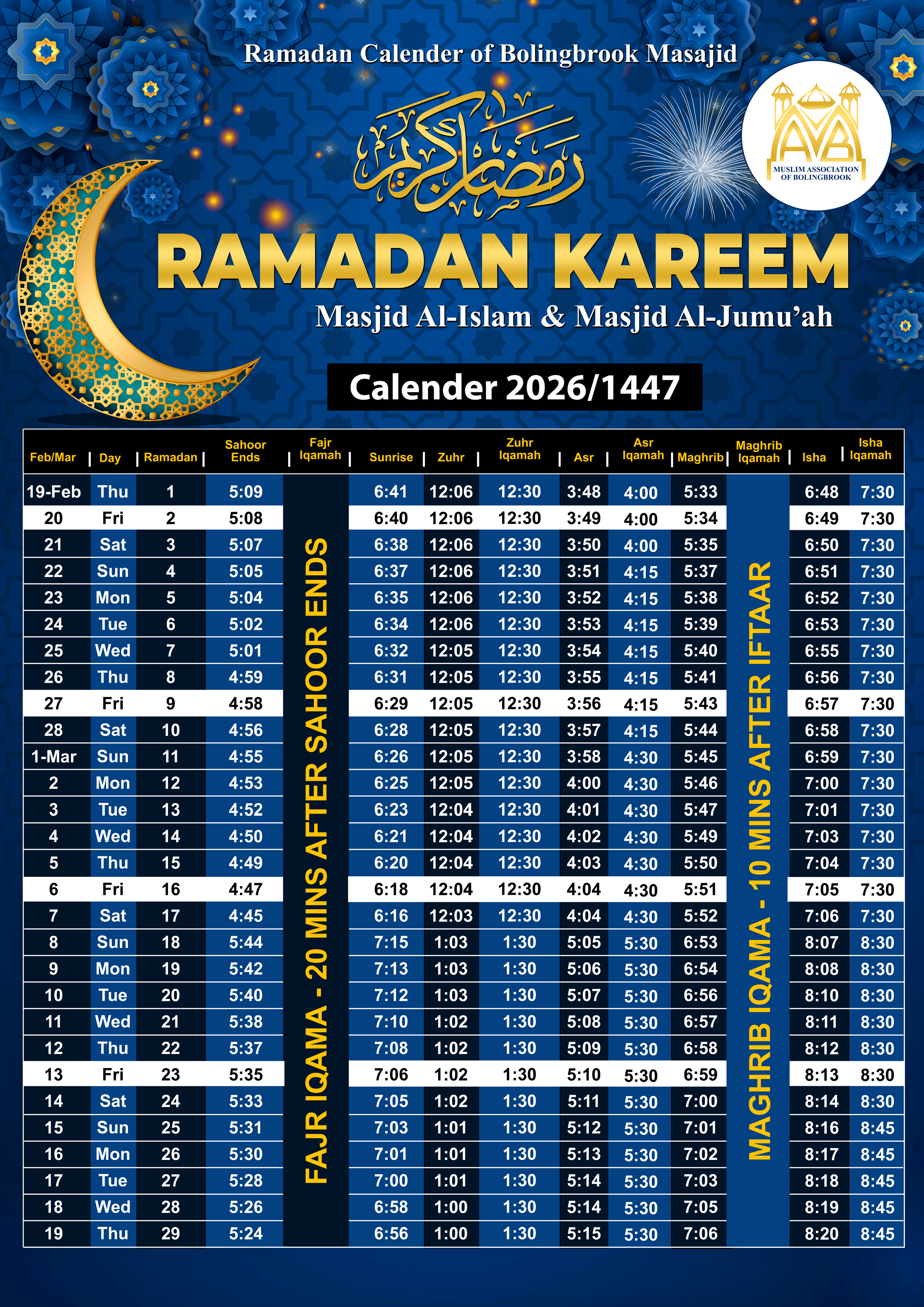 The Muslim Association of Bolingbrook follows the Chicago Hilal Committee for moon sightings to determine the start and end of Ramadan. For updates, please visit: www.chicagohilal.org