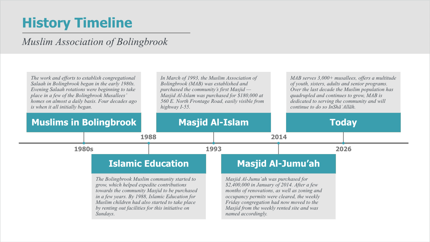 - Where given MAB’s diverse facilities for prayer, education, health, physical activity, and end-of-life needs, the area in and around Bolingbrook has become, by the grace of Allah ﷻ, highly sought-after for relocating Muslim families; and