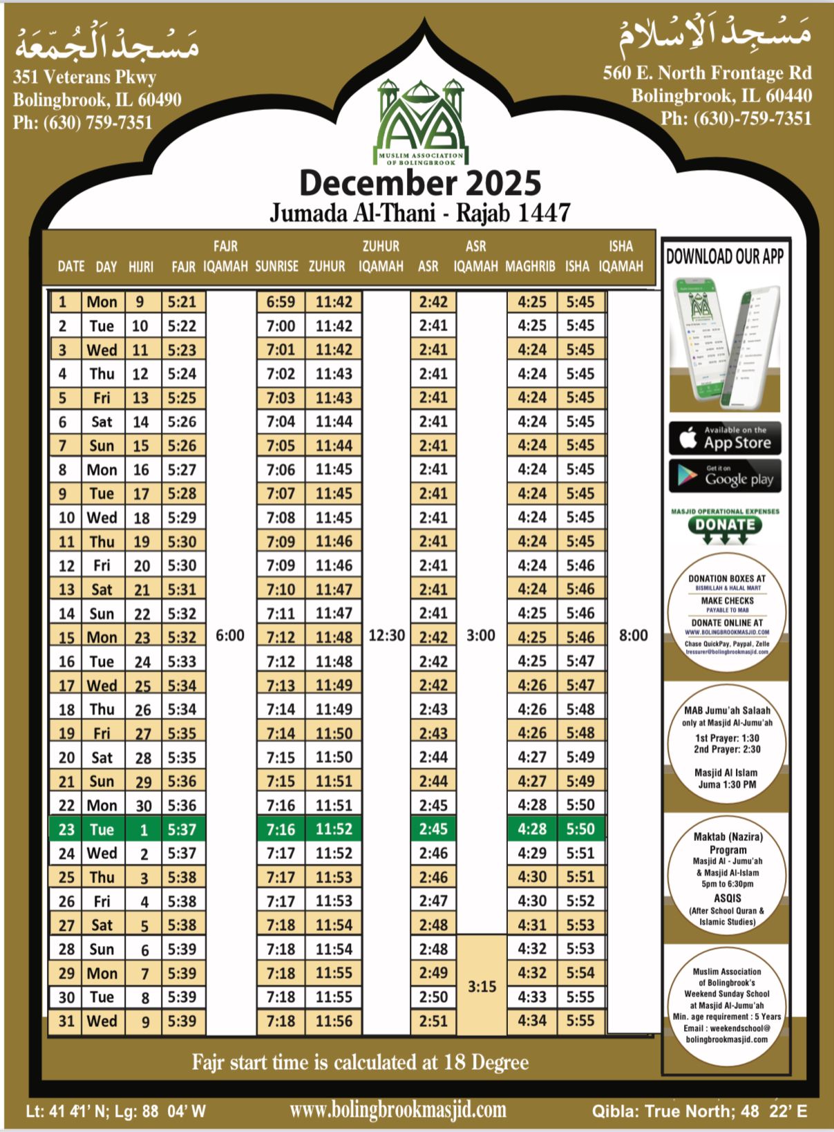 Dhuhr 11:44 AM Iqamah 12:30 PM
